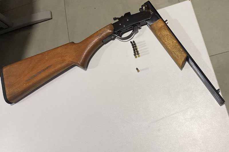 A equipe policial fez buscas na casa e localizou a espingarda artesanal adaptada para calibre 22 e 13 munições para o armamento. O suspeito afirmou ser o dono da arma, mas confirmou que não possuía documentação para portar o objeto.