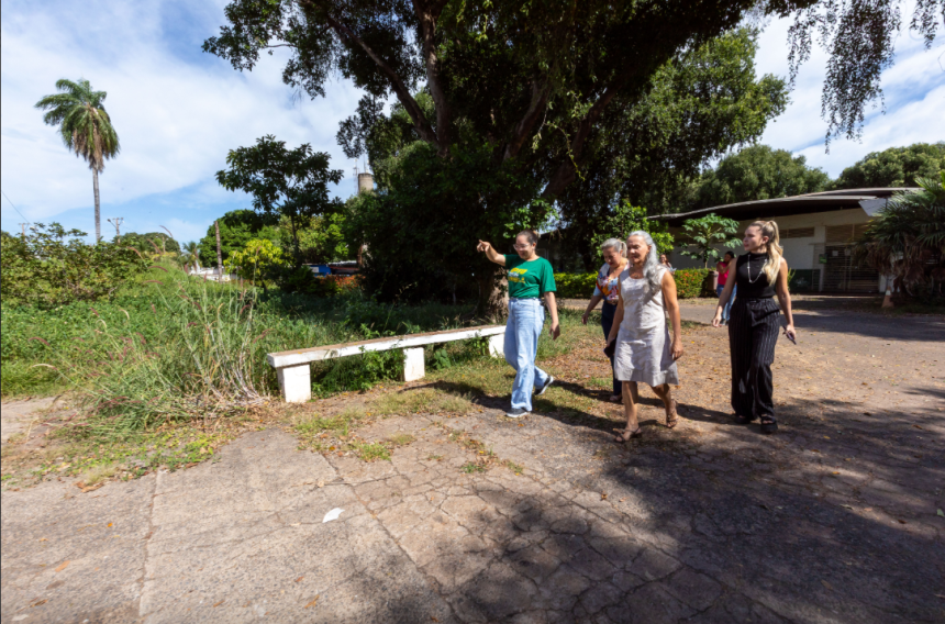 A imagem mostra a secretária de Saúde de Cuiabá, Lúcia Helena Barboza Sampaio, durante uma visita técnica em prédios de propriedade da prefeitura de cuiaba em compahnia de outros servidoras. O ambiente é aberto e apresenta muita vegetação.